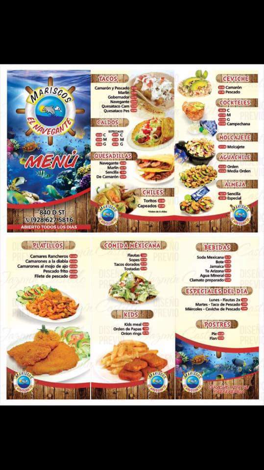 Welcome to Mariscos El Navegante, your go-to destination for authentic seafood in San Luis, AZ. Nestled at 840 D St, this charming restaurant serves up a delightful array of dishes that celebrate the flavors of the sea. Noteworthy tacos feature scrumptious fillings like Beto Pulpo adobado and crispy shrimp, each served with house-made guacamole and a crunchy surimi topping. For a heartier option, try the flavorful Caldo de CamarĂ³n, a favorite among regulars.